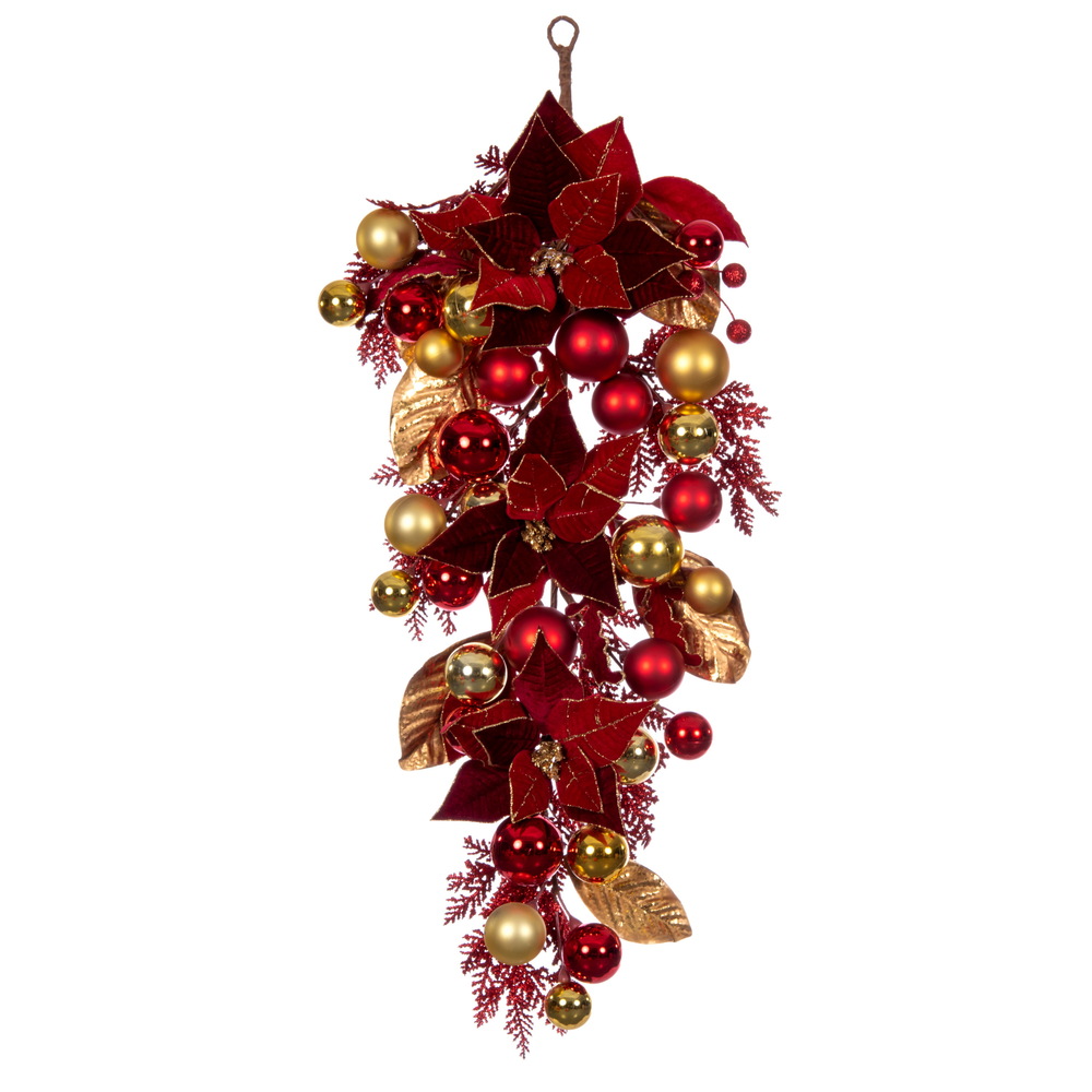 Vickerman 6' Red Poinsettia Deco Garland. This brilliant artificial Christmas garland is predecorated and features a mixture of red and gold ornaments that vary in finish size and texture. The ornaments on this garland are made with durable shatterproof plastic. The garland is made with a blend of Poinsettias and foliage to create the perfect look. Recommended For Indoor Use Only
