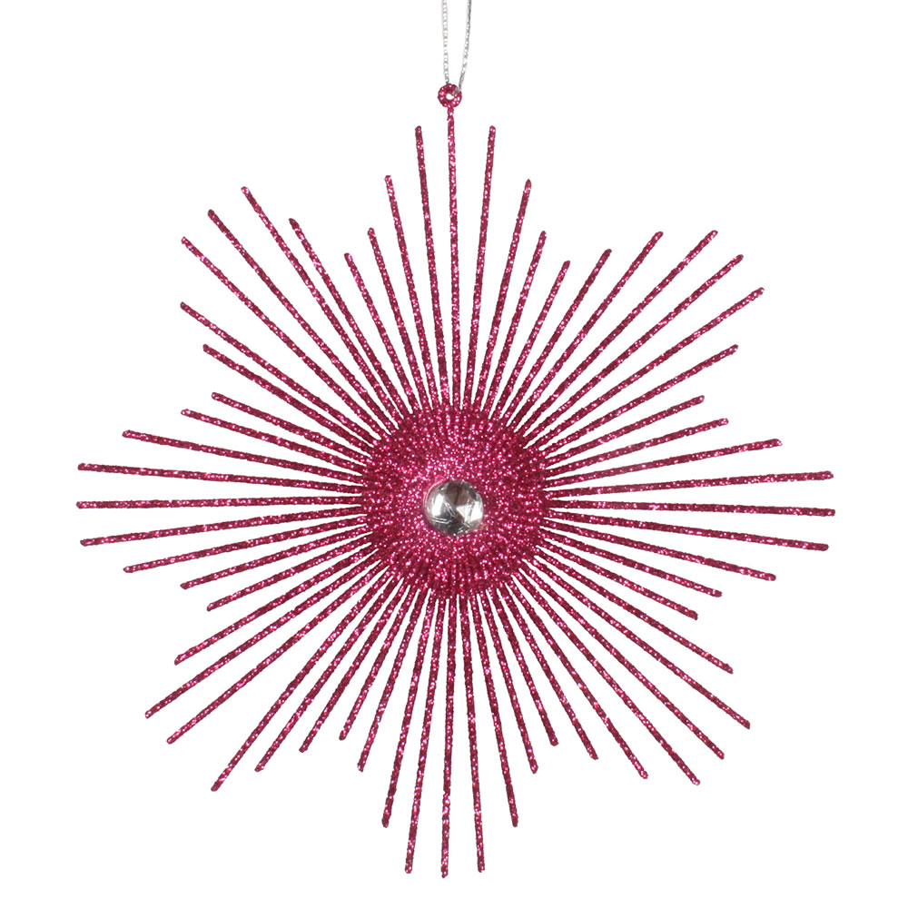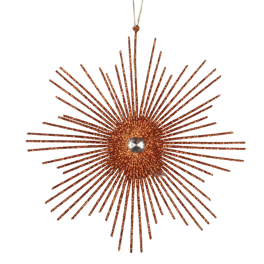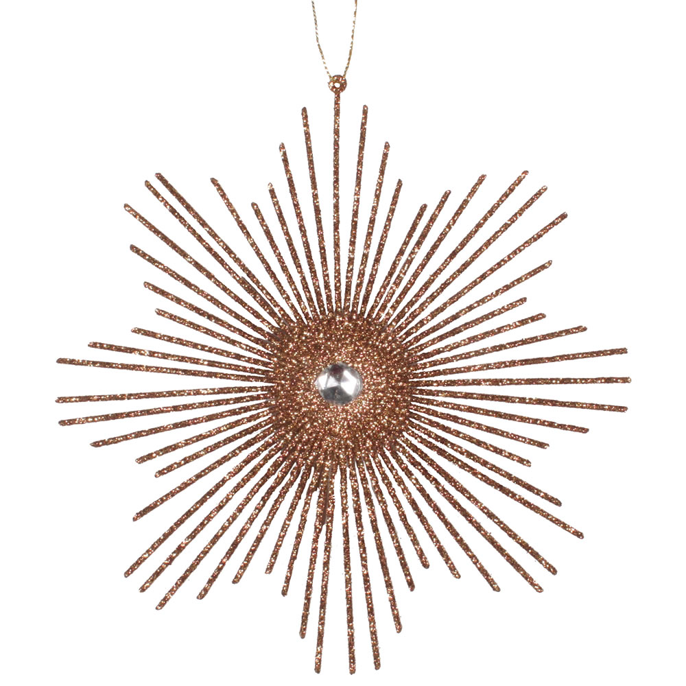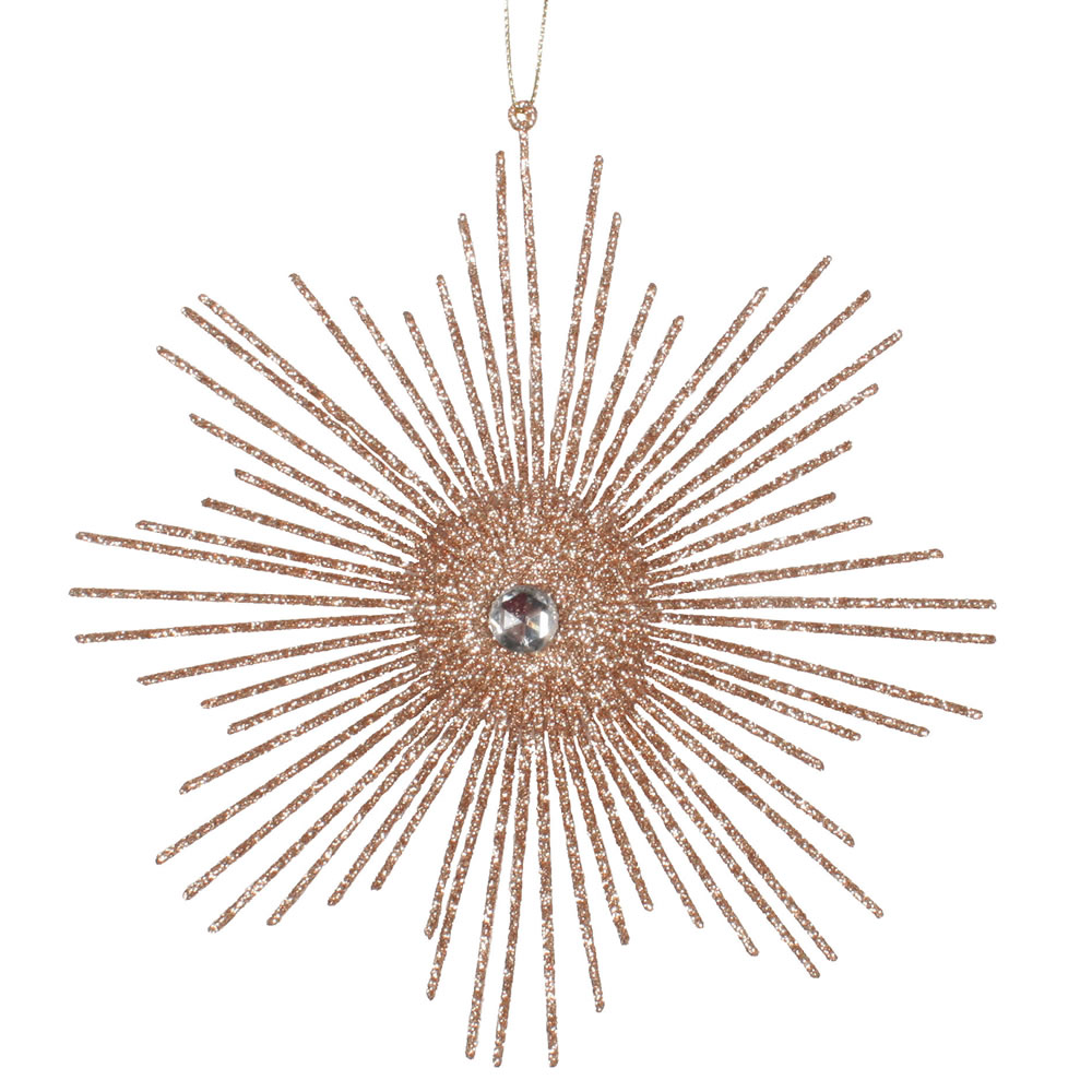 Vickerman 6.5" Champagne Snowflake Burst Glitter Christmas Ornament. Complete your holiday ornament collection with this glamorous Snowflake Burst ornament it comes generously embellished with sparkling glitter features a brilliant jewel in the center and is made of shatterproof plastic. Includes 6 pieces per bag.