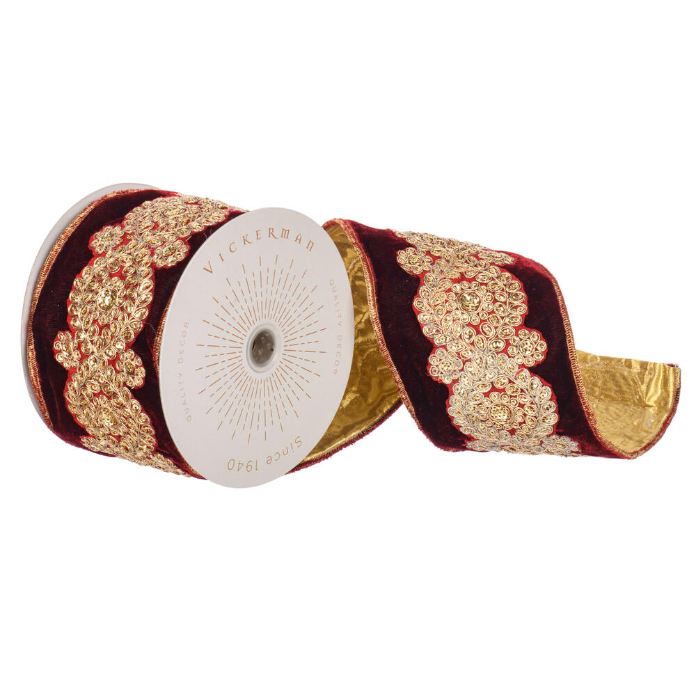 4"x5yd Wine Velvet Ribbon Gold Sequin