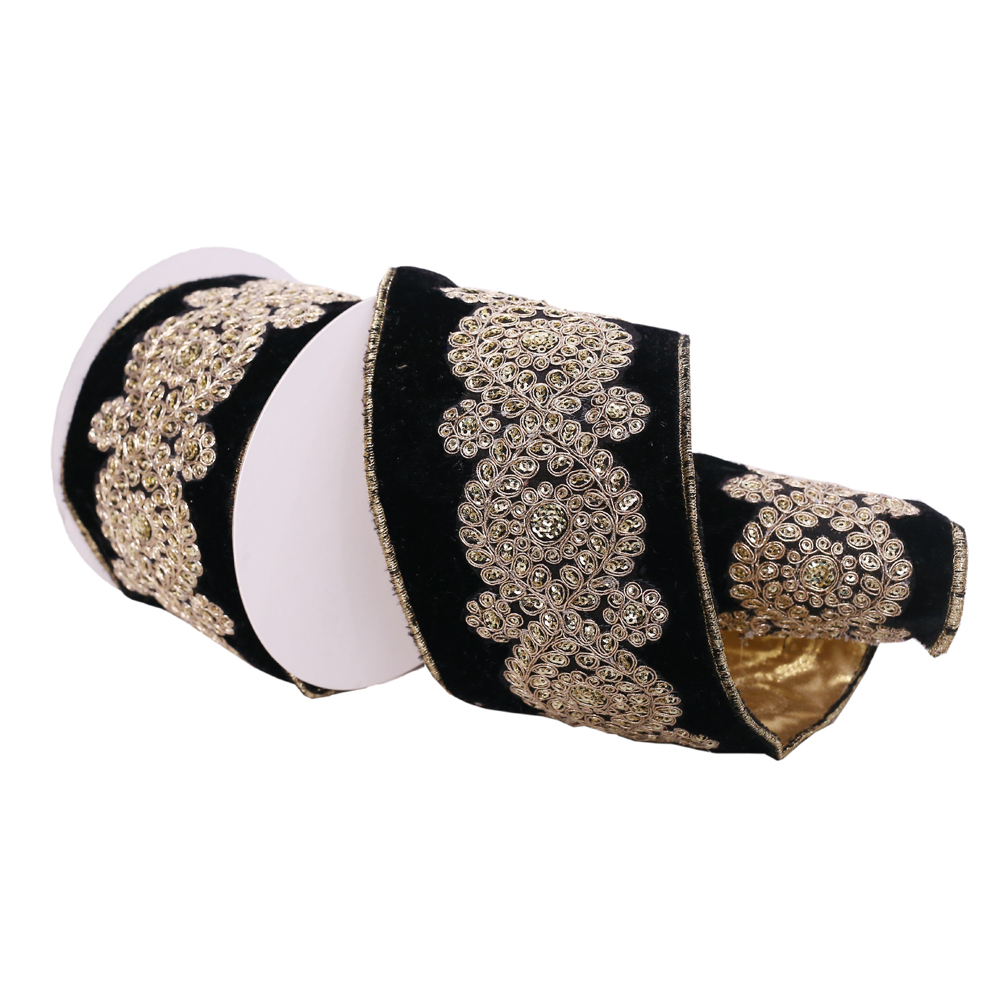 4"x5yd Black Velvet Ribbon Gold Sequin
