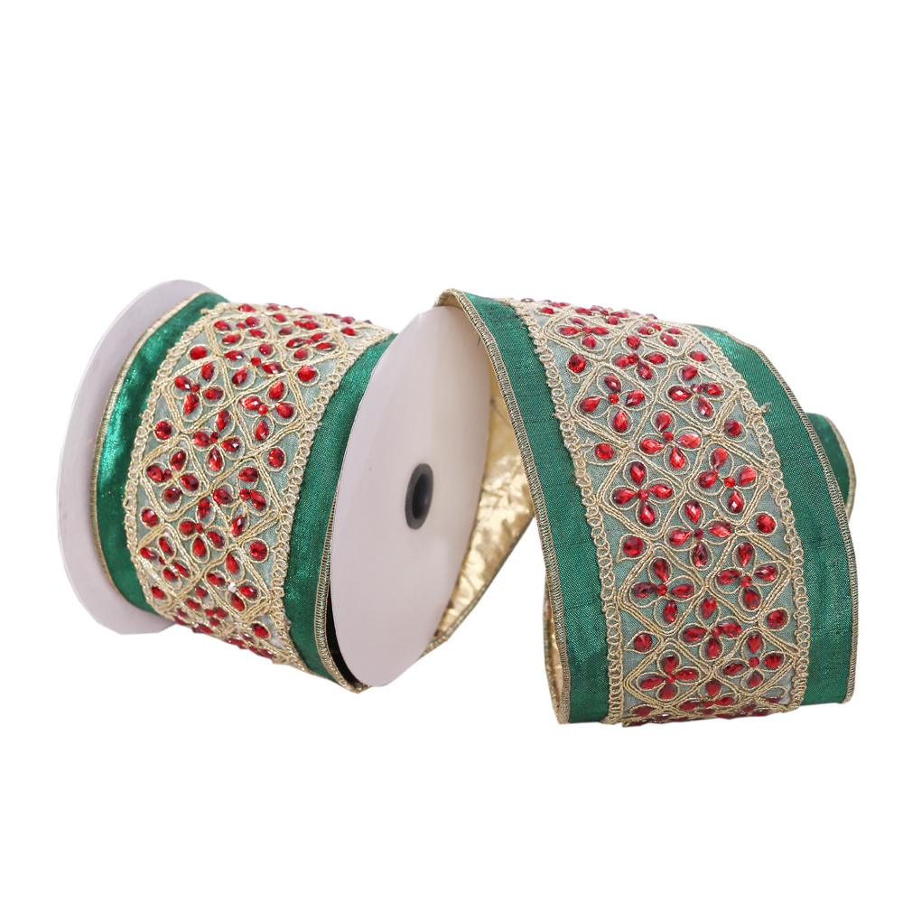 4"x5yd Green with Red Jewels Ribbon